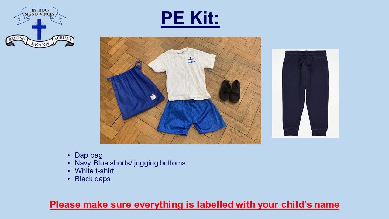 PE Kit: Blue shorts, white T-shirt* and daps – to be kept in PE kit bag