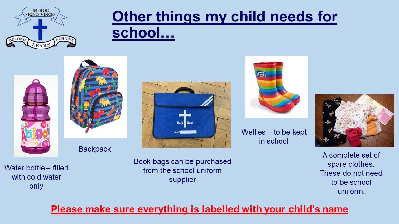 Children are also required to have a library bag* to help keep our school books in good condition. Please ensure that all items of school clothing are clearly marked with your child’s name.