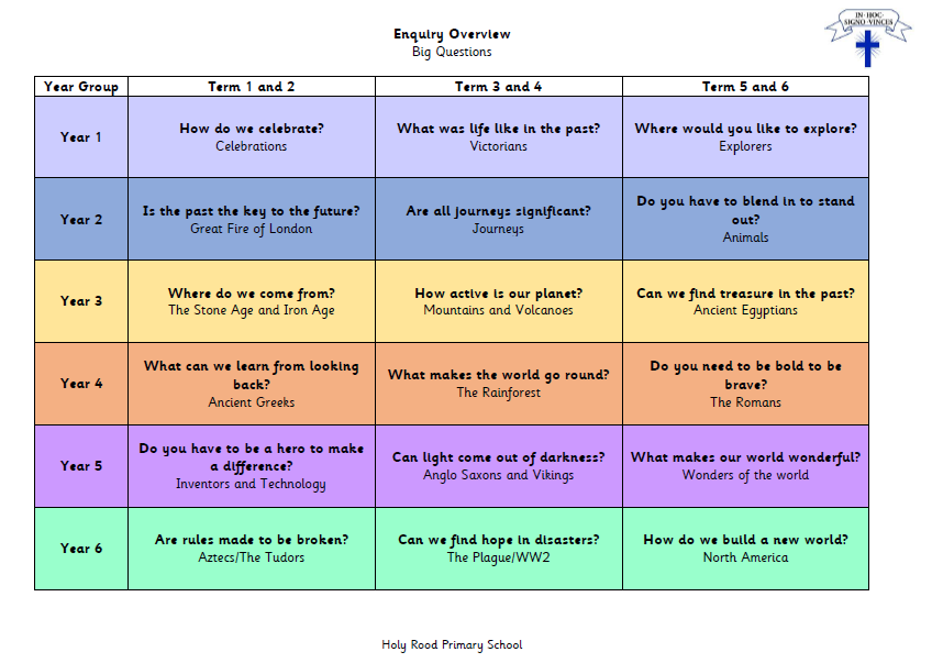 In all year groups, our study of history and geography is driven by our 'Big Questions'. The chart below shows the questions posed to each year group, and the areas of history and geography linked to each.