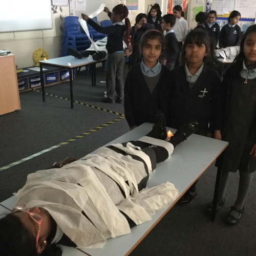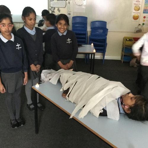 In Year 3, the children have been learning about the Egyptian process of mummification. They role-played the ceremony to find out more.