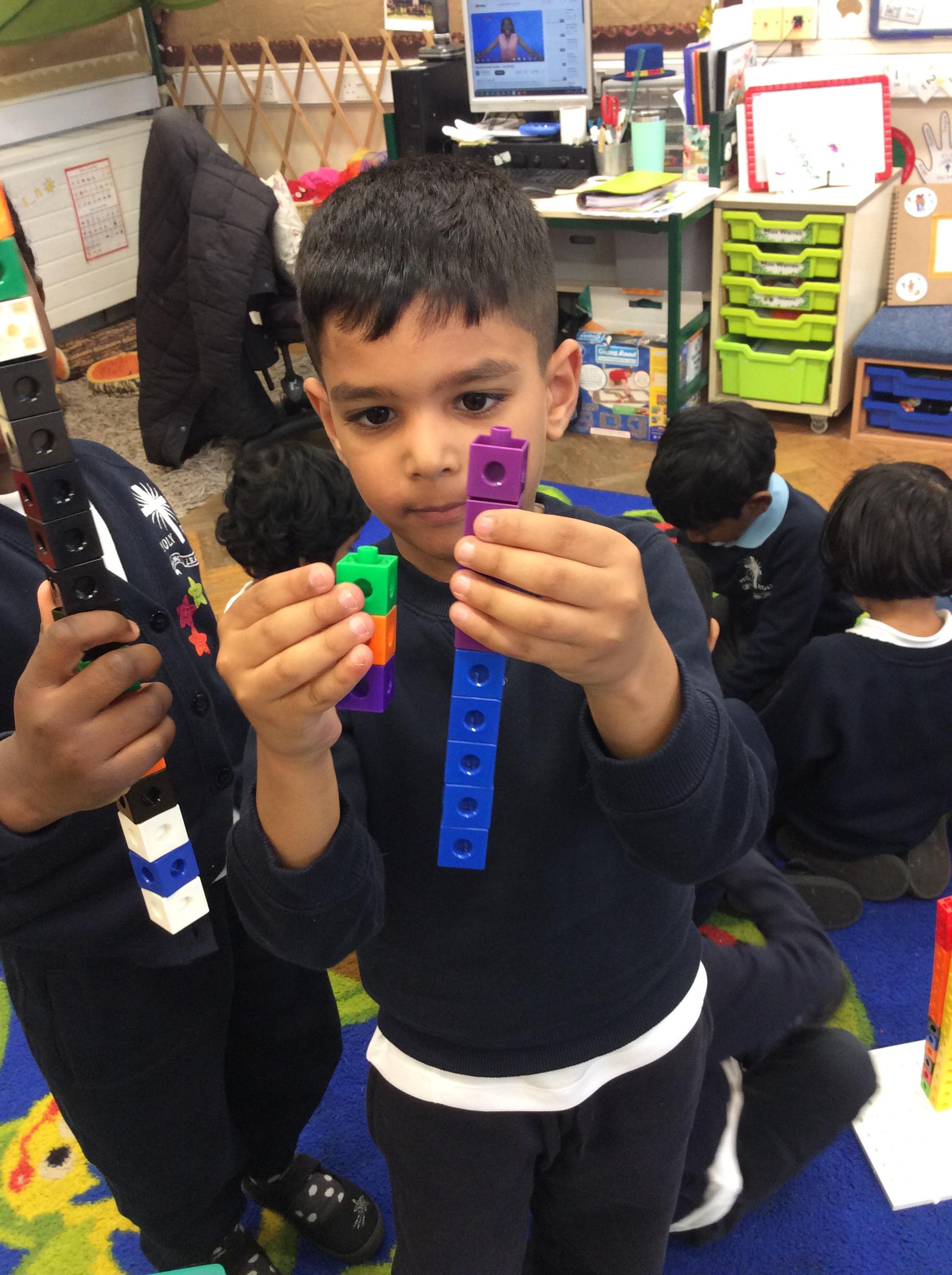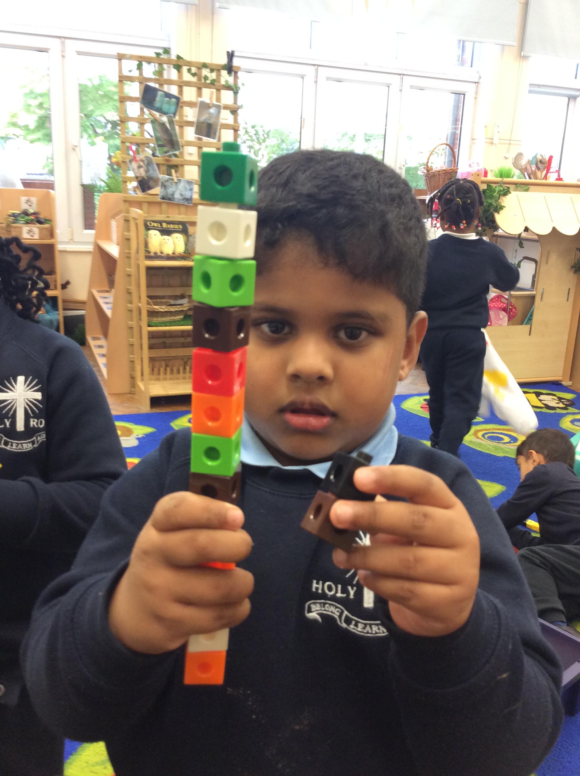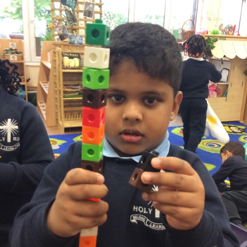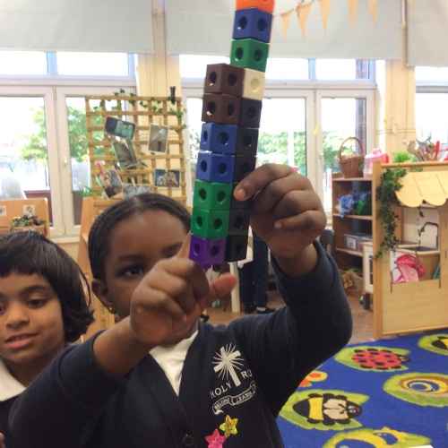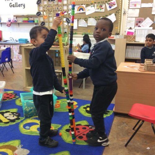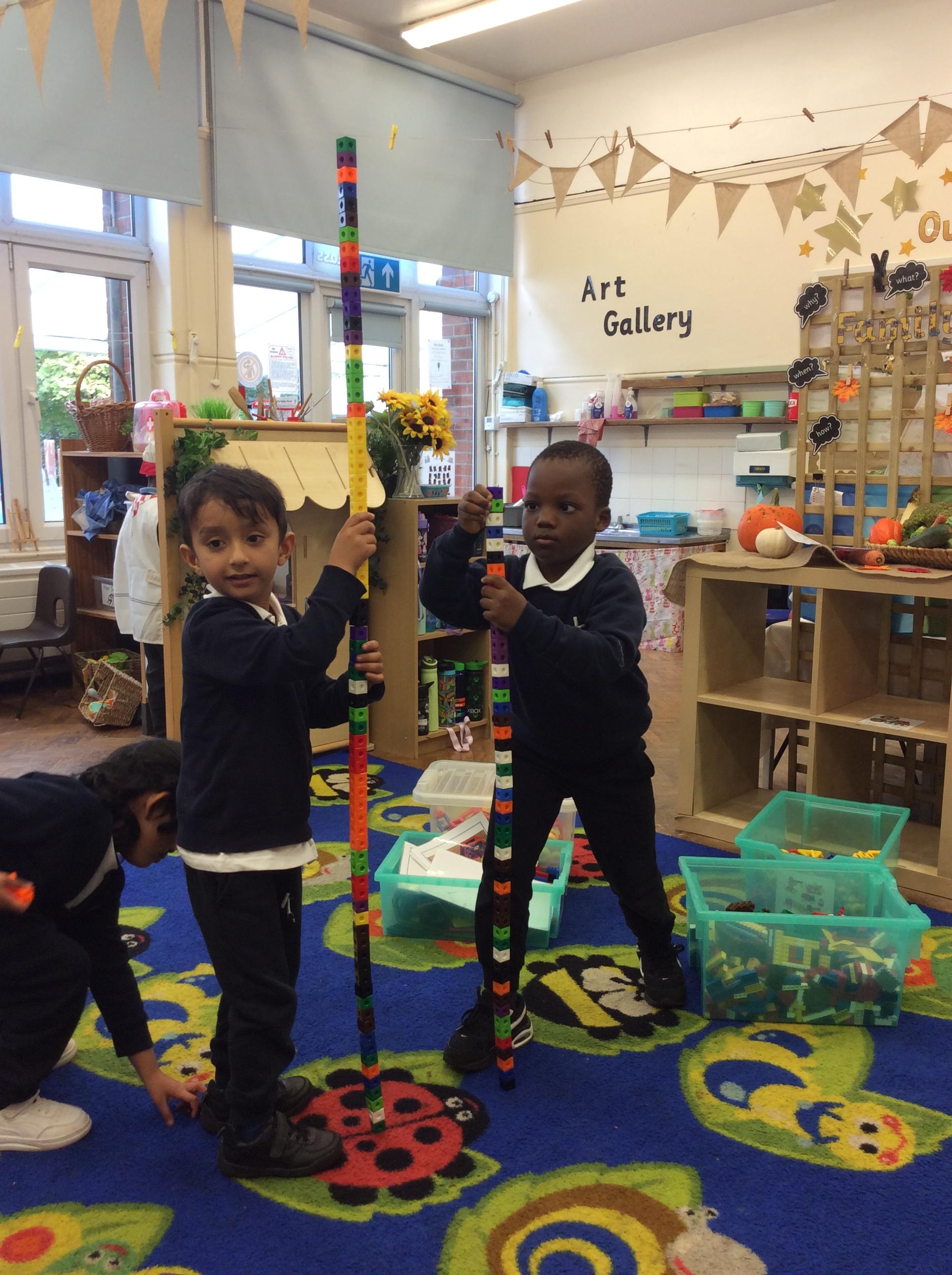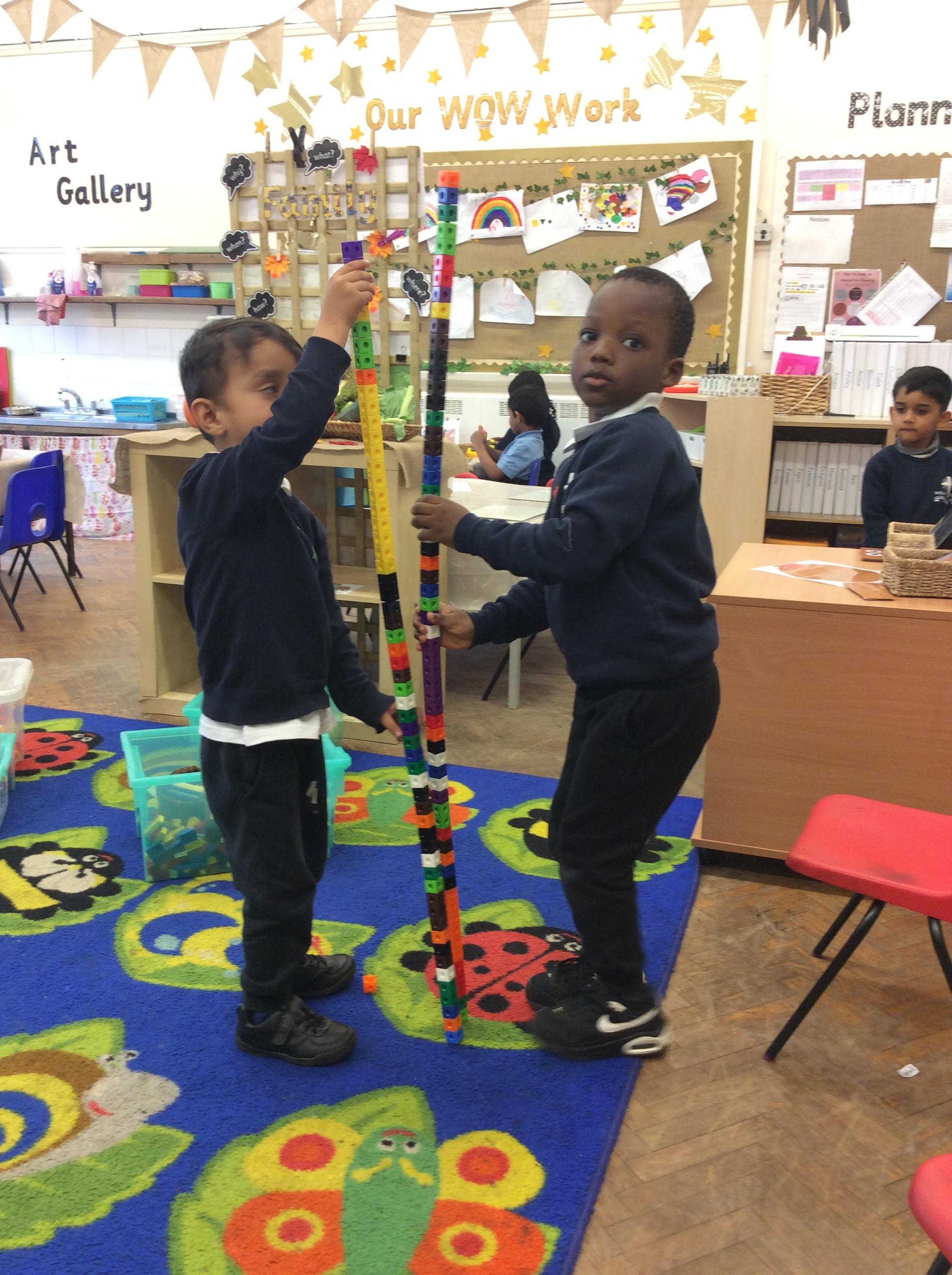 In maths we have been comparing height, length and quantities using the words, 'tall', 'short', 'long' and more. We have enjoyed exploring different activities and practising using these words to compare.